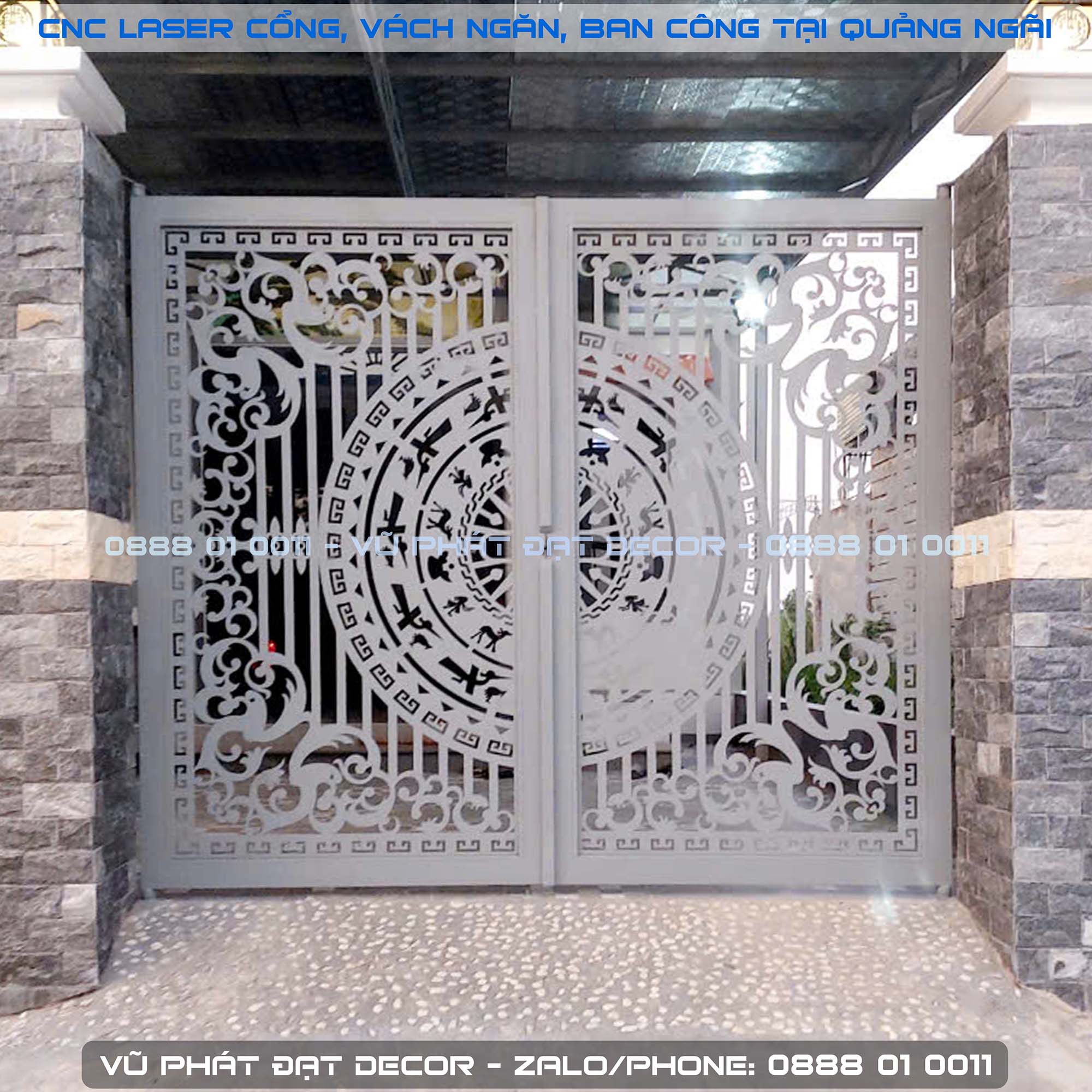 Mẫu cổng mang biểu tượng trống đồng đặc trưng của văn hóa Việt, tạo điểm nhấn mạnh mẽ và sang trọng cho mặt tiền.